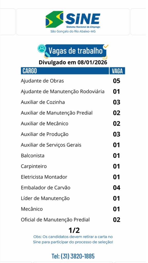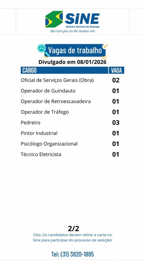 Vagas de empregos no SINE de São Gonçalo do Rio Abaixo para hoje 08 de janeiro de 2026