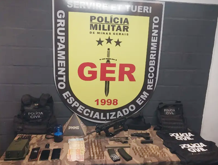 Na tarde dessa quarta-feira (7), no bairro Santa Rita, na cidade de Juiz de Fora, a Polícia Militar de Minas Gerais (PMMG), por meio da 4ª Cia. PM Ind. PE, com apoio dos militares do 2° BPM e da 4ª Base Regional de Aviação do Estado (BRAVE), apreendeu um fuzil Cal. 556 – HK, uma pistola Glock 9mm (kit Rajada), uma pistola Ramon 9mm (Kit Rajada), 39 munições Cal. 556, 44 munições Cal. 9mm, dois carregadores de fuzil .556, dois carregadores de pistola, um bloqueador de sinais de rádio, dois coletes modulares, quatro placas de colete de cerâmica (GLAGIO) e a importância de R$1.380,00.