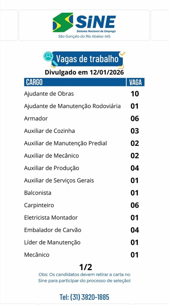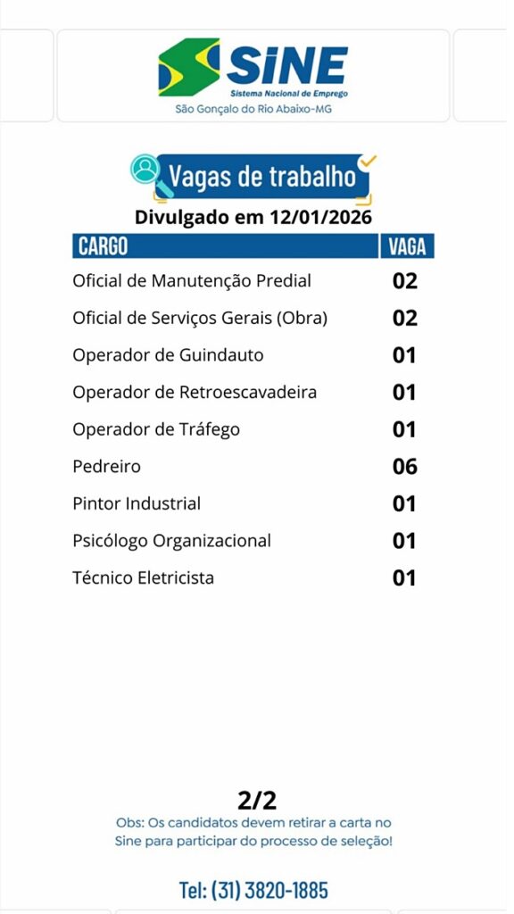 [07:49, 12/01/2026] SINE – São Gonçalo do Rio Abaixo – MG: Bom dia, pessoal! 🌞