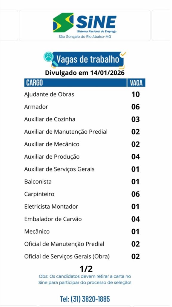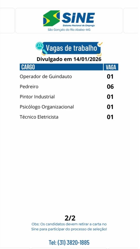 Segue a relação das vagas em aberto na data de hoje no SINE de São Gonçalo do Rio Abaixo – MG.