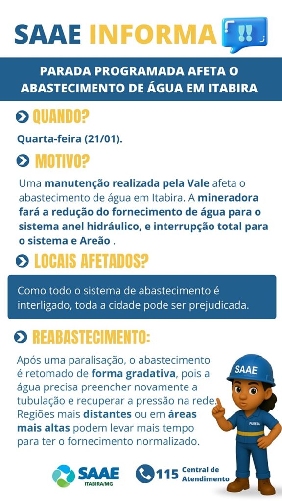 Uma manutenção realizada pela Vale afeta o abastecimento de água em Itabira na próxima quarta-feira (21/01). A mineradora fará a redução do fornecimento de água para o sistema anel hidráulico, e interrupção total para o sistema e Areão entre às 08h às 16h. Como todo o sistema de abastecimento de Itabira é interligado, o abastecimento em toda a cidade pode ser prejudicado.
