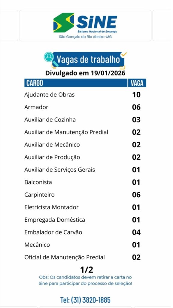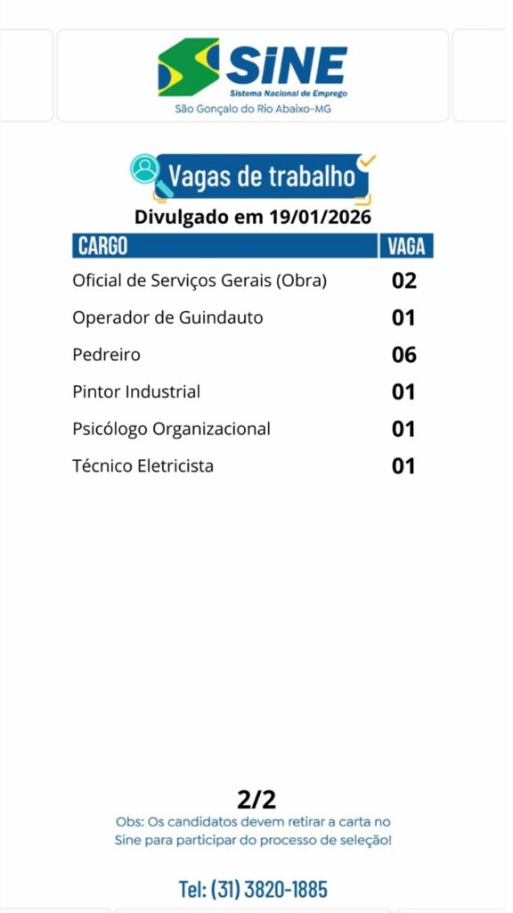 Segue a relação das vagas em aberto na data de hoje no SINE de São Gonçalo do Rio Abaixo – MG.