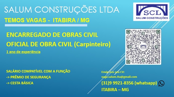 Vagas de emprego na Salum Construções LTDA 20/01/2026, 06:49 0share Facebook WhatsApp Compartilhar Link para envio do Currículo;WhatsApp – 31999218356 Deixe um comentário Cancelar respostaO seu endereço de email não será publicado. Campos obrigatórios marcados com *Comentário * Nome * Email * Site Guardar o meu nome, email e site neste navegador para a próxima vez que eu comentar.