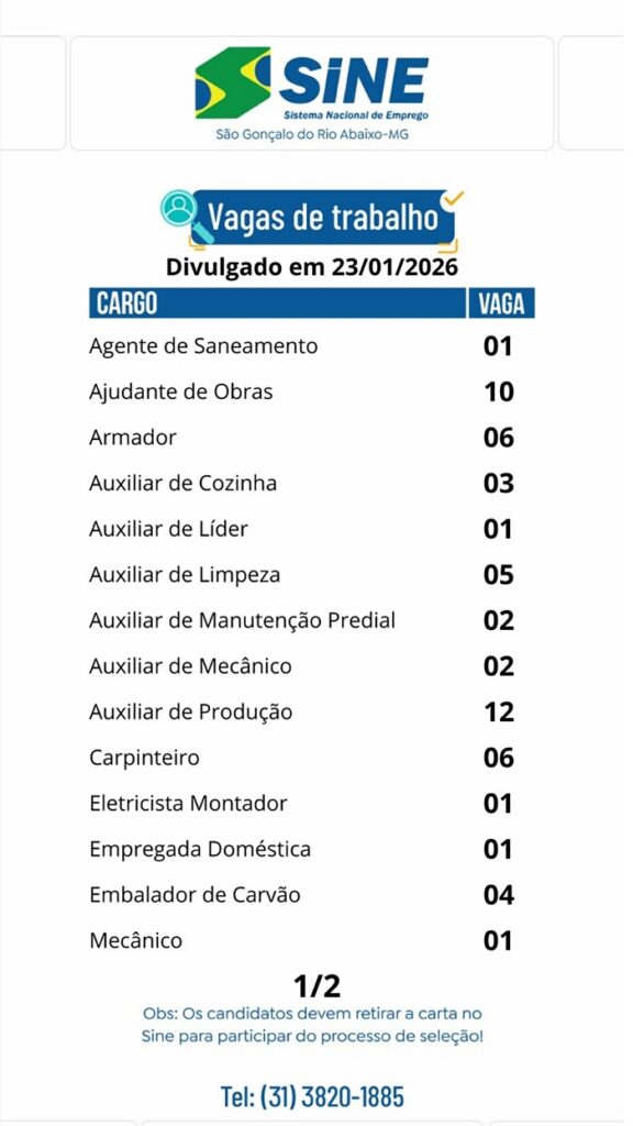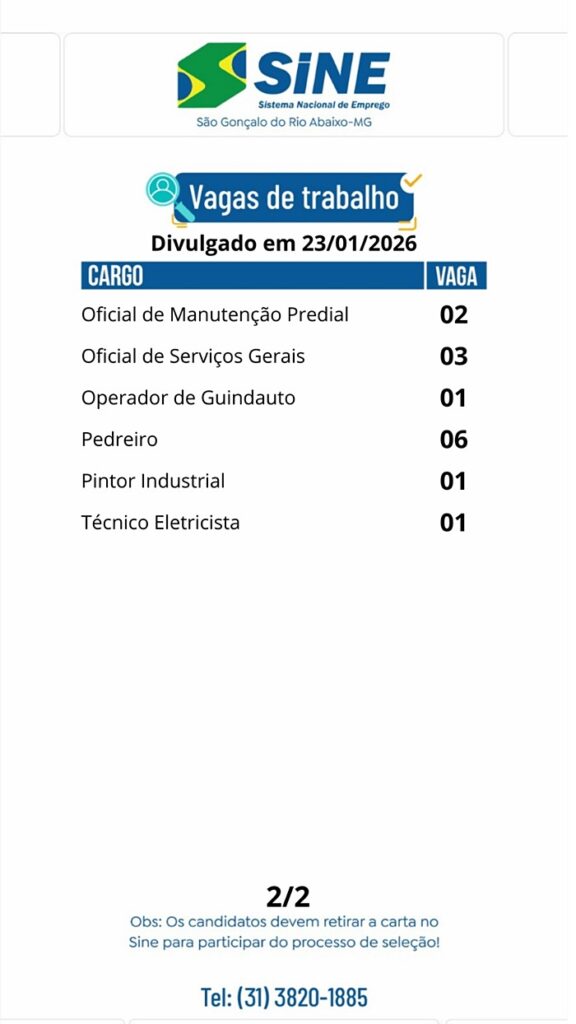 Vagas de empregos no SINE de São Gonçalo do Rio Abaixo para hoje 23 de janeiro de 2026