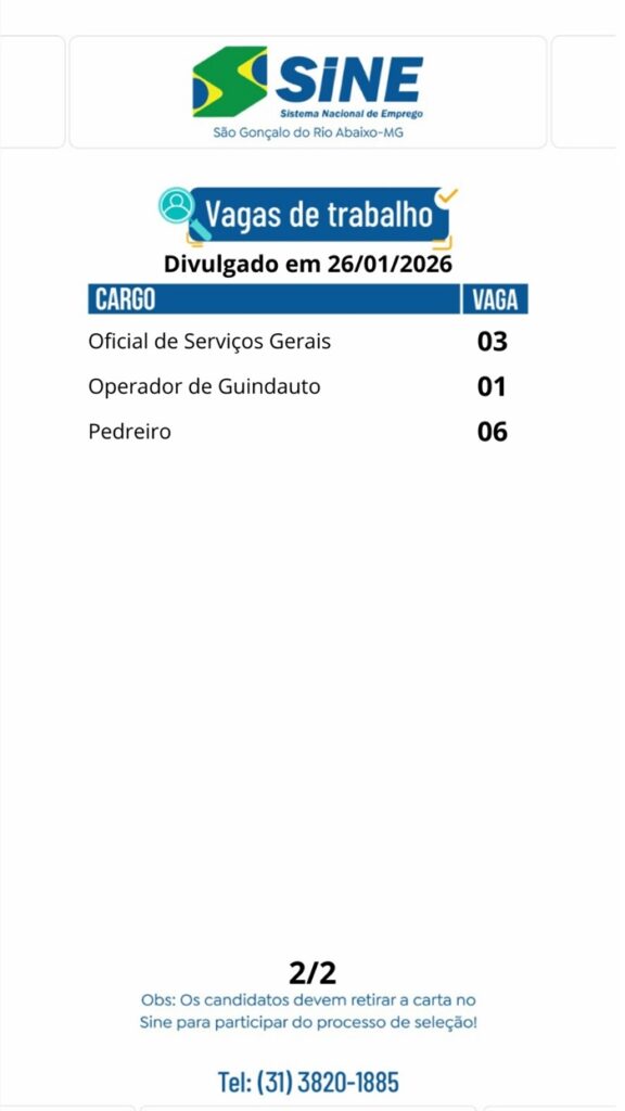 Segue a relação das vagas em aberto na data de hoje no SINE de São Gonçalo do Rio Abaixo – MG.