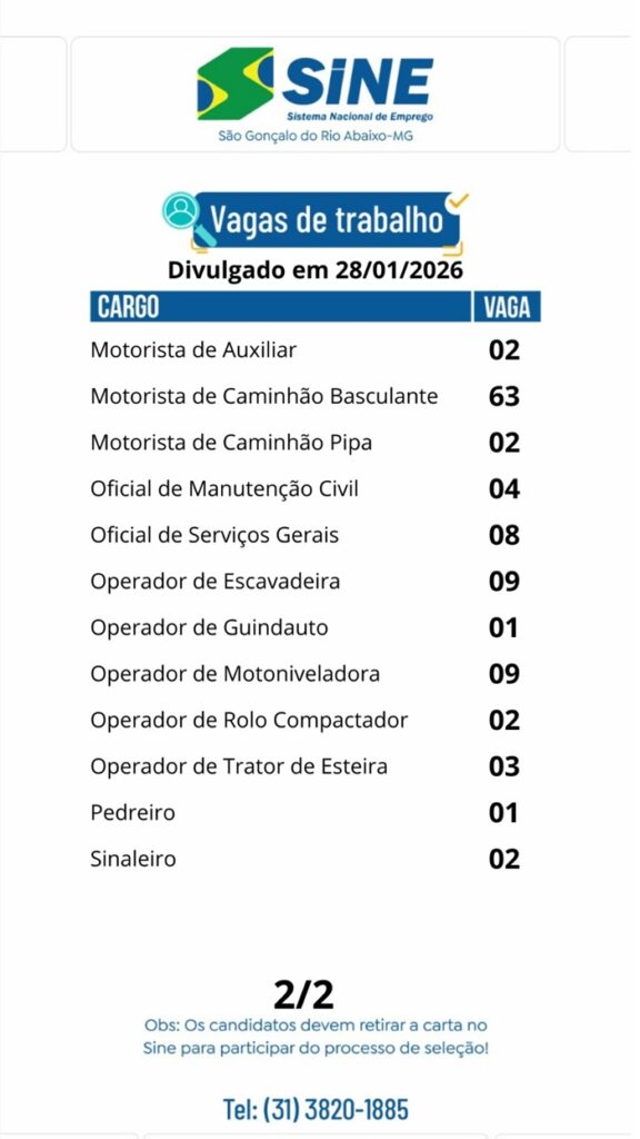 Segue a relação das vagas em aberto na data de hoje no SINE de São Gonçalo do Rio Abaixo – MG.