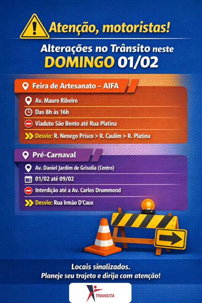 A Transita informa que, no próximo domingo, 1º de fevereiro de 2026, haverá interdições e alterações no trânsito em importantes vias do município em razão da realização de eventos culturais. Das 8h às 16h, a Avenida Mauro Ribeiro será interditada no trecho compreendido entre a rotatória da Rua Vereador Nenego Prisco (Viaduto do São Bento) e a Rua Platina, para a realização da feira promovida pela Associação de Artesão Itabirano Fazendo Arte (AIFA). Durante esse período, os motoristas que seguirem no sentido Centro deverão utilizar como rota alternativa a Rua Vereador Nenêgo Prisco, Rua Caulim, Rua Platina e, em seguida, retornar à Avenida Mauro Ribeiro.