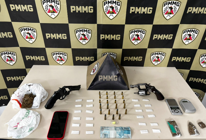 Na busca pessoal, os policiais localizaram um revólver na cintura do homem. Em diligências complementares, foi encontrado um segundo revólver, além de grande quantidade de drogas, munições e materiais comumente utilizados para o tráfico de entorpecentes.