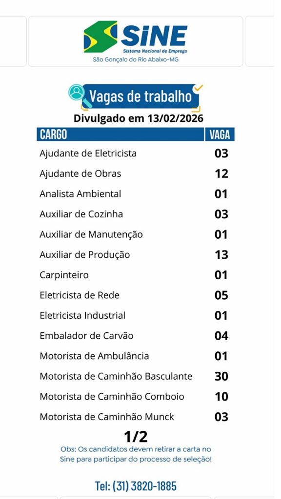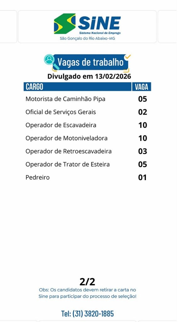 Segue a relação das vagas em aberto na data de hoje no SINE de São Gonçalo do Rio Abaixo – MG.
