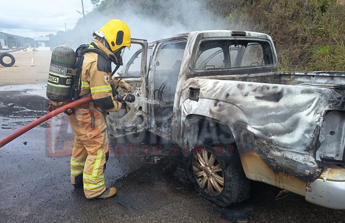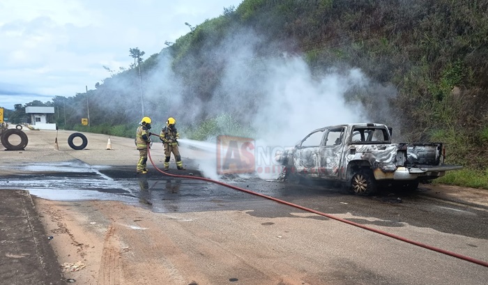 ITABIRA(MG)- Uma caminhonete ficou completamente destruído após incêndio registrado na tarde desta quinta-feira, 26 de fevereiro de 2026, por volta das 13h, no km 102 da rodovia MG-129 no bairro Barro Branco.