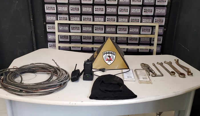 Os militares compareceram a um lote com construção em andamento, onde localizaram dois rádios comunicadores (HT), uma base de carregamento ligada por meio de conexão clandestina à rede pública de energia elétrica — caracterizando furto de energia — além de ferramentas de procedência duvidosa.