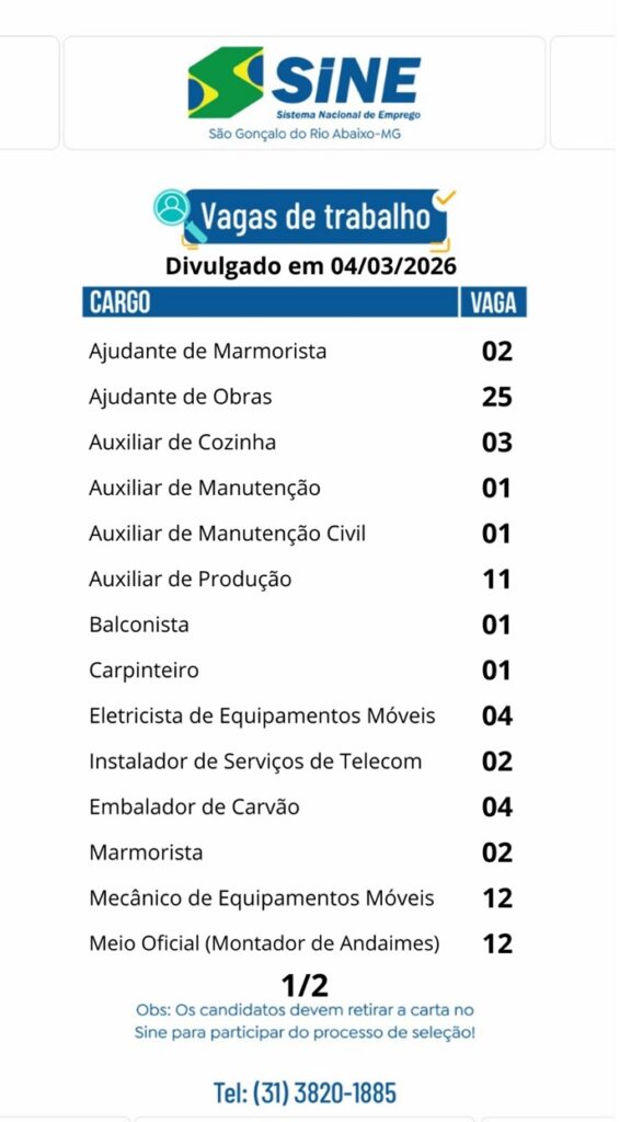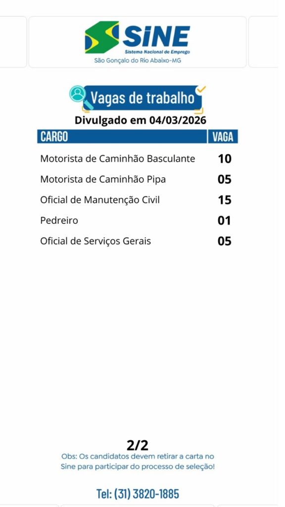 Segue a relação das vagas em aberto na data de hoje no SINE de São Gonçalo do Rio Abaixo – MG.