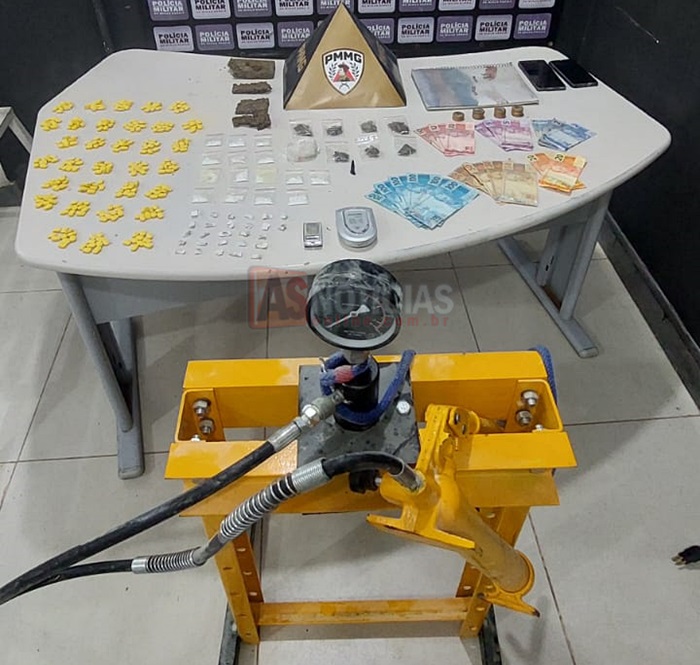 Durante buscas no interior do imóvel, os policiais localizaram diversas porções de entorpecentes, além de uma balança de precisão, uma prensa hidráulica, dinheiro em espécie, aparelhos celulares e um caderno de anotações utilizado para o controle do tráfico de drogas.