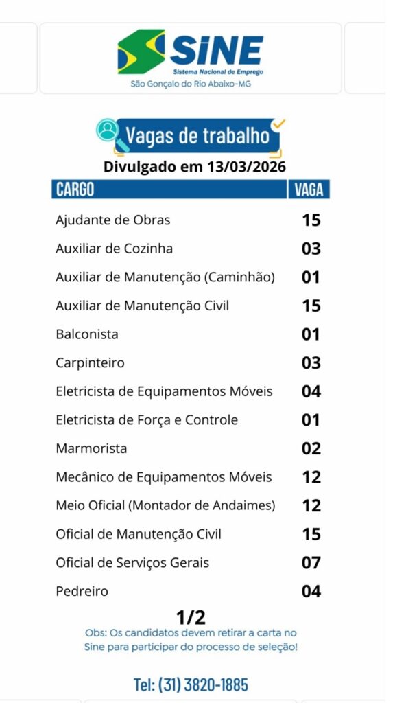 [08:25, 13/03/2026] SINE – São Gonçalo do Rio Abaixo – MG: Atualização: