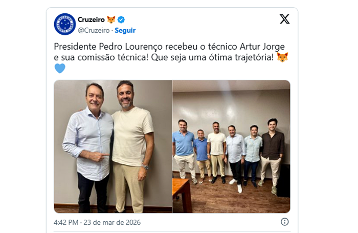 Anunciado pelo clube no último domingo (22), Artur Jorge chegou à capital mineira no início da tarde desta segunda. O treinador foi recepcionado por funcionários celestes, torcedores e profissionais de imprensa, concedendo suas primeiras palavras como comandante celeste.