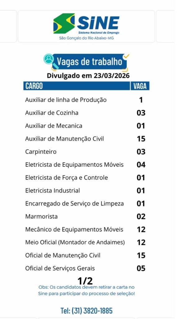 Segue a relação das vagas em aberto na data de hoje no SINE de São Gonçalo do Rio Abaixo – MG.