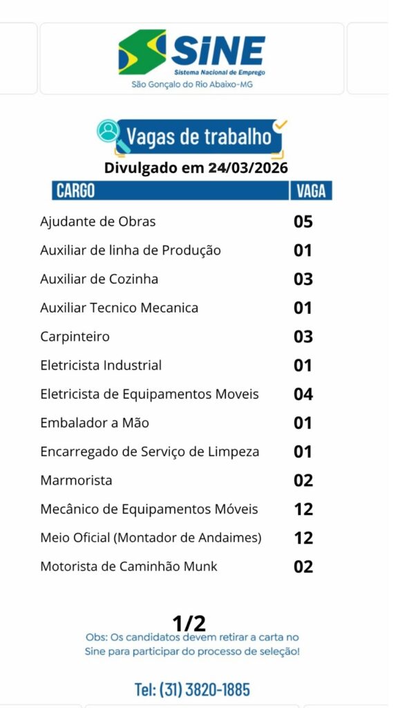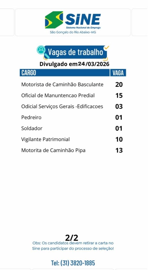 Vagas de empregos no SINE de São Gonçalo do Rio Abaixo para hoje 24 de março de 2026 24/03/2026, 09:59 0share Facebook WhatsApp Compartilhar Nosso horário de funcionamento é: Segunda a quinta-feira: das 08h às 17h Sexta-feira: das 08h às 16h (Exceto feriados) Deixe um comentário Cancelar respostaO seu endereço de email não será publicado. Campos obrigatórios marcados com *Comentário * Nome * Email * Site Guardar o meu nome, email e site neste navegador para a próxima vez que eu comentar.