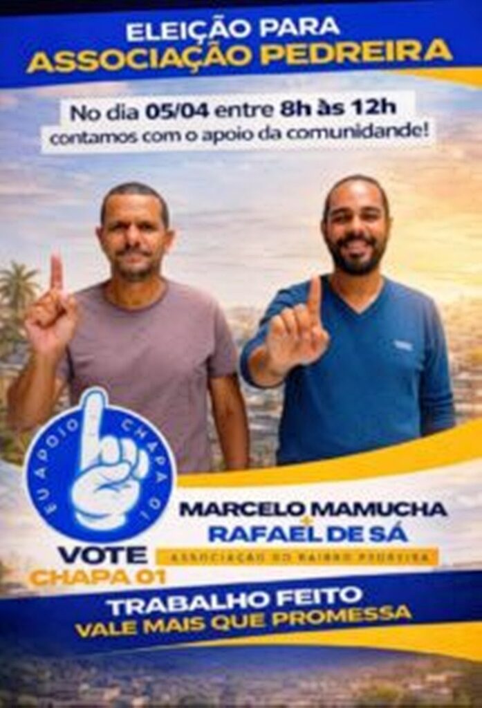 A Chapa Um é encabeçada por Marcelo “Mamucha”, tendo Rafael de Sá como candidato a vice, apoiados pela atual gestão. Com o slogan “Trabalho Feito Vale Mais que Promessa”, o grupo destaca a continuidade de ações e projetos já desenvolvidos na comunidade, buscando o apoio dos moradores com base em experiências anteriores.