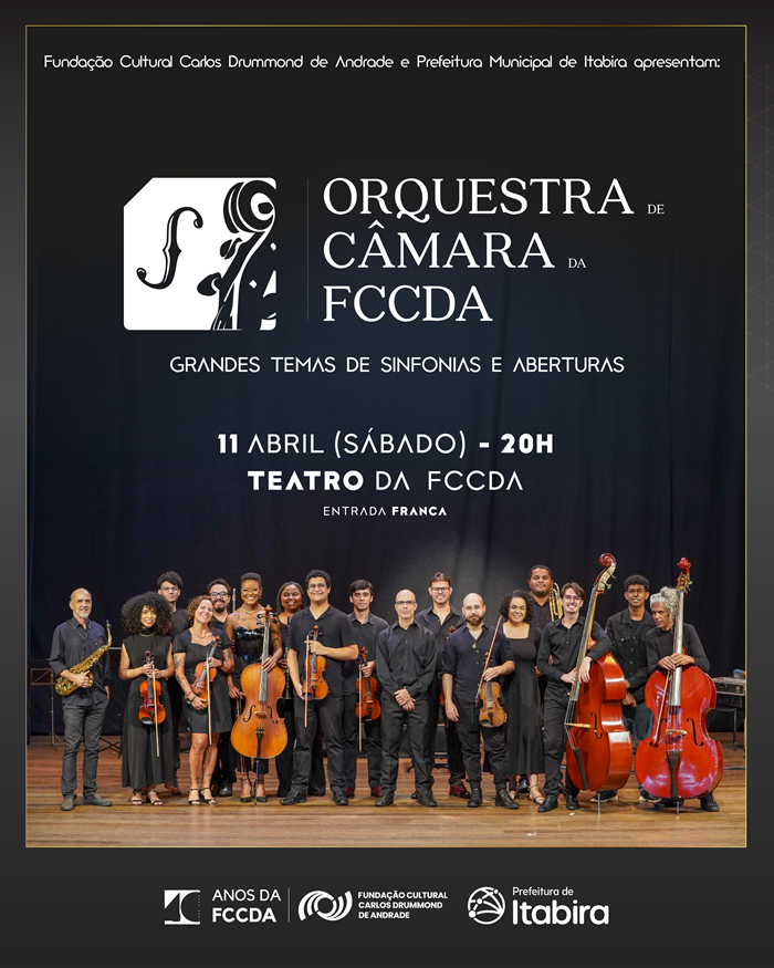 A Fundação Cultural Carlos Drummond de Andrade (FCCDA), dá início a temporada 2026 da Orquestra de Câmara da FCCDA com um concerto especial. A apresentação acontece no dia 11 de abril (sábado), às 20h, no Teatro da FCCDA, com entrada franca.