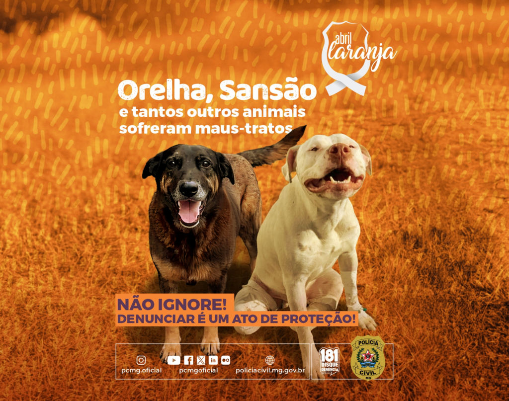 Em abril, mês da campanha de conscientização e prevenção contra a crueldade e maus-tratos aos animais, a Polícia Civil de Minas Gerais (PCMG) alerta: praticar abuso, ferir, mutilar ou causar sofrimento a animais domésticos, silvestres ou domesticados é crime.
