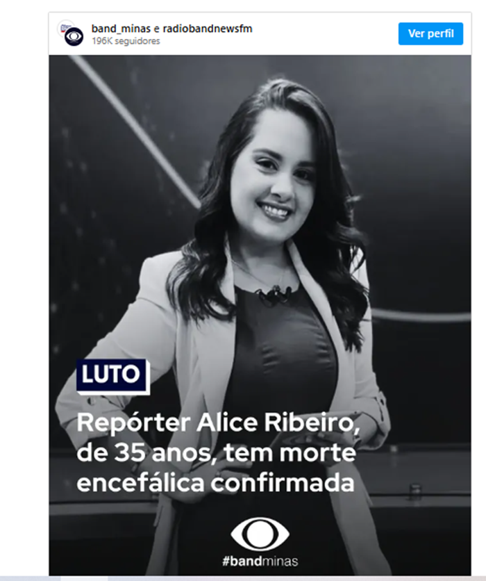 “Profissional querida pela equipe, deixa os pais, o irmão, o marido e um filho de nove meses. A Band Minas, em luto, lamenta a partida precoce de Alice, e afirma que está prestando toda a assistência à família da repórter”, diz um trecho do comunicado divulgado pela emissora.