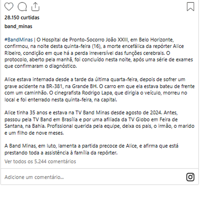 A repórter Alice Ribeiro, de 35 anos, da TV Band Minas, morreu nesta quinta-feira (16), em Belo Horizonte. Ela estava internada no Hospital João XXIII após ser vítima de um acidente entre um carro e um caminhão na BR-381, na Região Metropolitana da capital. A colisão ocorreu na quarta-feira (15) e também causou a morte do cinegrafista da emissora, Rodrigo Lapa.