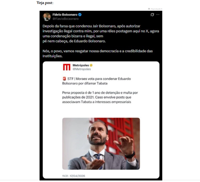 “Depois da farsa que condenou Jair Bolsonaro, após autorizar investigação ilegal contra mim, por uma reles postagem aqui no X, agora uma condenação bizarra e ilegal, sem