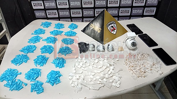 Durante as buscas no barracão, os militares encontraram os suspeitos fracionando entorpecentes sobre uma bancada. Foram apreendidos diversos pinos de cocaína e pedras de crack já prontos para comercialização, além de porções de pasta base de cocaína com marcação indicativa de 50 gramas e a quantia de R$ 161 em dinheiro. Ainda conforme a Polícia Militar, foi constatada a instalação de uma câmera de segurança em um poste de energia pública em frente ao imóvel, utilizada para monitorar a aproximação de viaturas policiais e dificultar a ação das equipes. O equipamento foi apreendido.