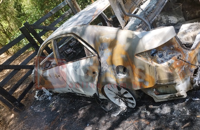 Veículo roubado é encontrado totalmente carbonizado na estrada de acesso à Lagoa do Peti em São Gonçalo do Rio Abaixo