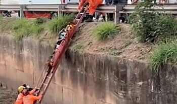 in Polícia Motociclista cai em canal após se assustar com linha de pipa na avenida Almir Pessoa Magalhães, em Itabira