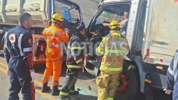in Polícia Motorista fica preso entre o volante e a cabine em um engavetamento de três caminhões na MG-129 em Itabira